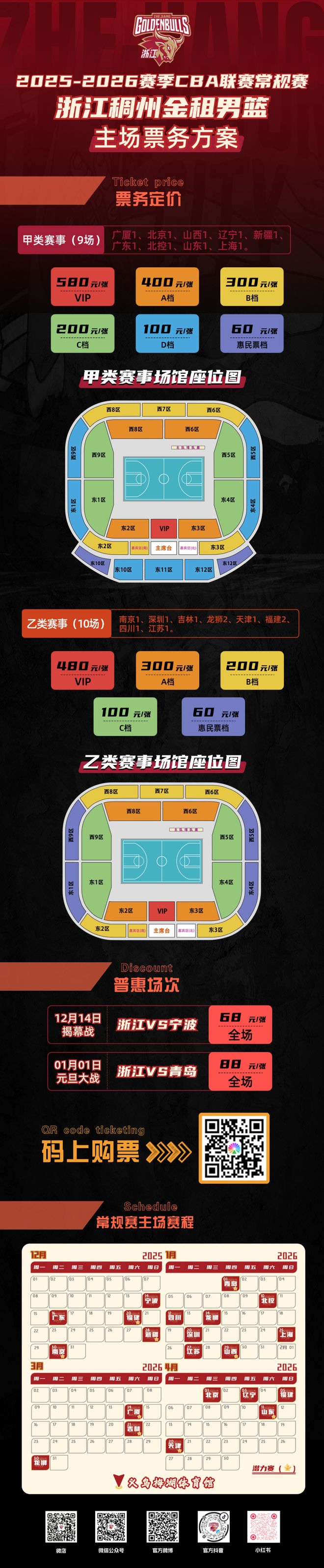 2025-2026赛季CBA联赛(义乌赛区)浙江稠州金租男篮常规赛将于12月14日正式打响,揭幕战全场68元!元旦大战全场88元!