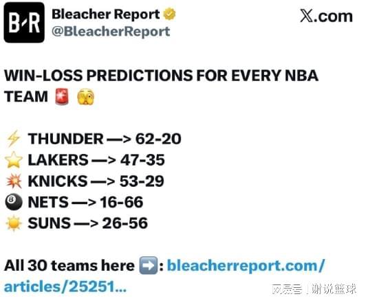 而BR也预测了各队,常规赛战绩情况,湖人和勇士并列,他们都被预测取得47胜35败的战绩。卫冕冠军雷霆领跑,被预测拿到62胜,布鲁克林篮网则垫底,毕竟他们阵容着实寒酸,也没什么战绩压力。